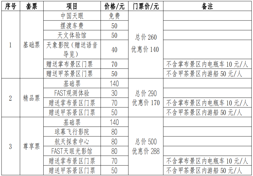为积极推动平塘县全域旅游的发展,使广大游客能够在近距离感受中国天眼“大国重器”宏伟壮观的同时,可以探索掌布“世界地质奇观”之奇特,领略甲茶亚热带田园风光之秀美,我公司最新推出了中国天眼科普基地、掌布景区、甲茶景区联动套票,现将门票价格及优惠政策公示如下: