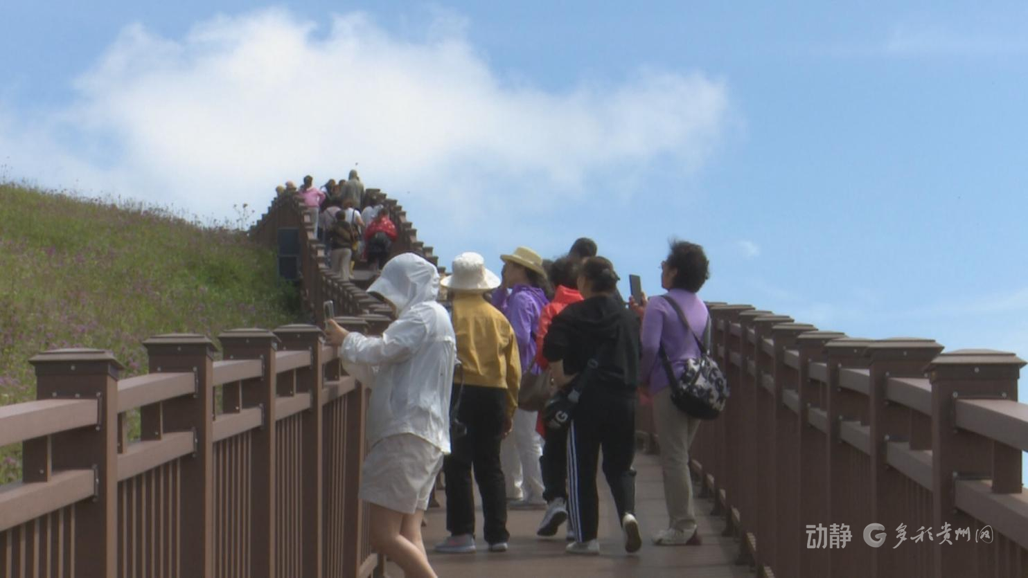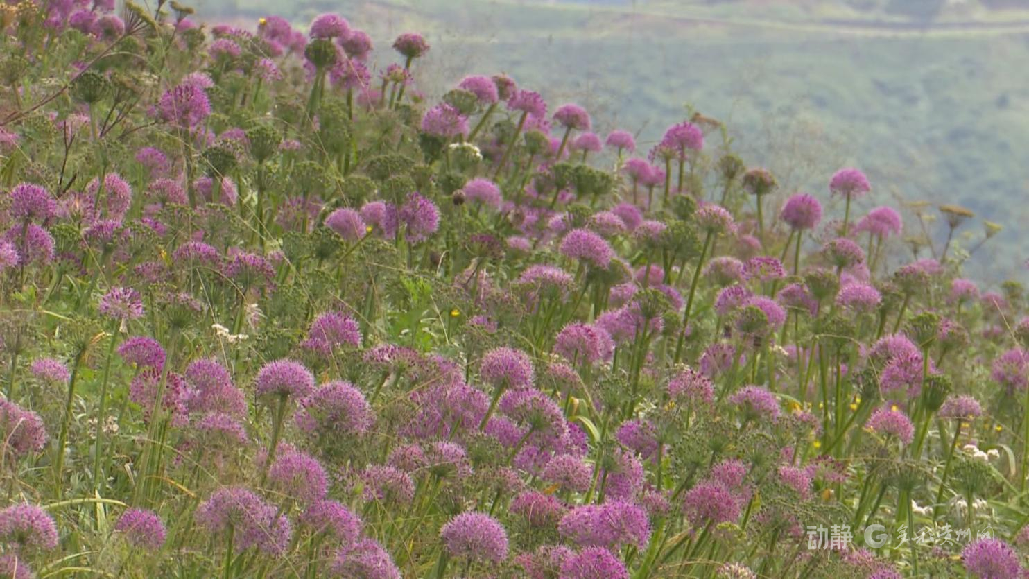 在毕节市赫章县阿西里西韭菜坪景区,十万亩韭菜花在海拔 2700多米的高原上肆意绽放,紫色的花海与蓝天白云相映成趣。许多游客漫步在景区步道上,欣赏绚烂花海、呼吸清新空气。