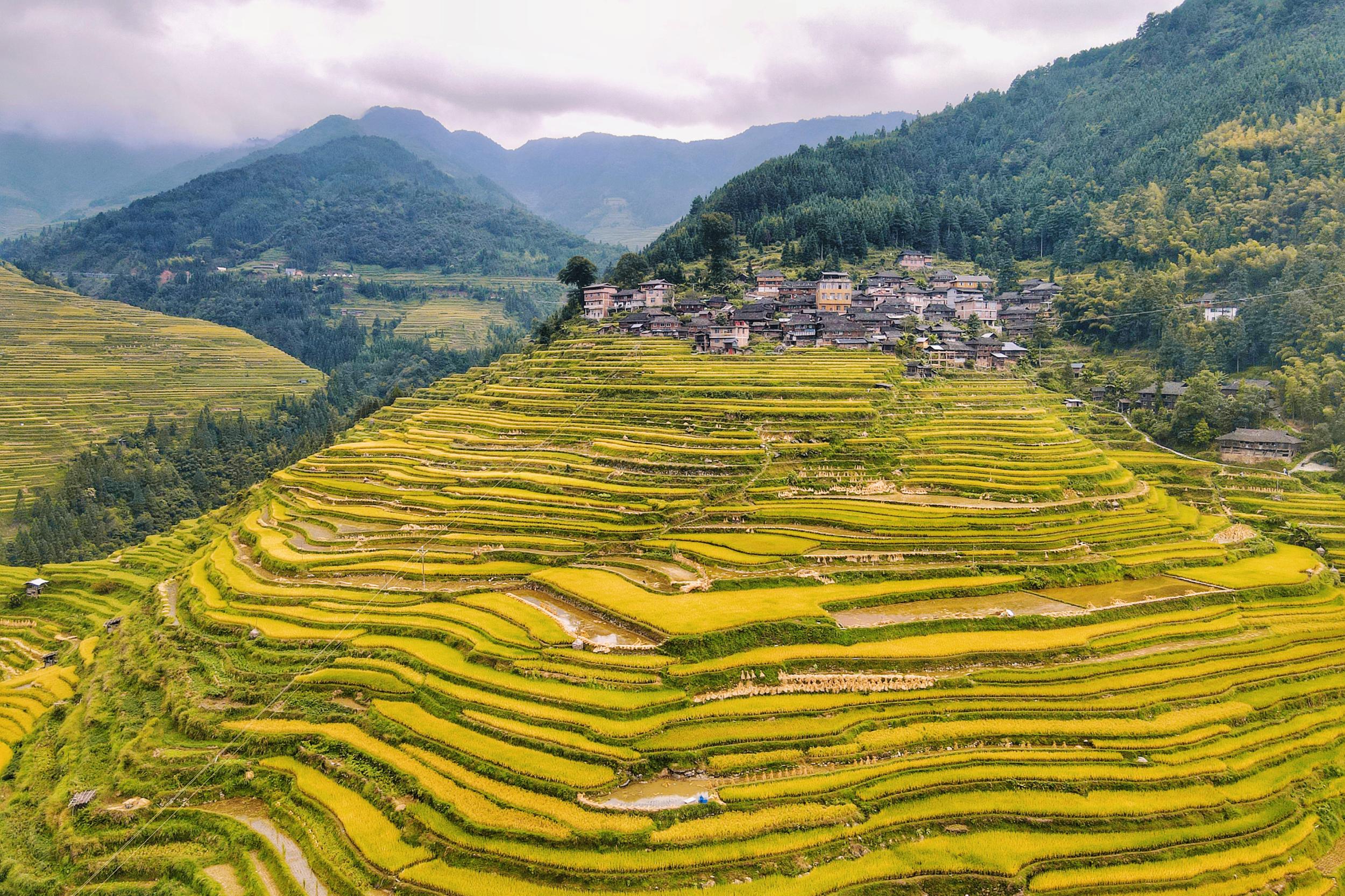 加榜梯田位于黔东南州从江县西部月亮山腹地,总面积近1万亩,从山脚盘绕到山巅,连绵25公里。金秋时节,金黄的稻穗形成饱满的金色弧线,风吹稻浪,壮美而有诗意。站在田埂上,稻香四溢,放眼望去梯田和村寨吊脚楼相辉映。在高峰观景台往下望去,近万亩的梯田遍布在山间,形成了独特壮美的景观。
