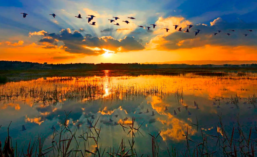 草海国家级自然保护区位于毕节市威宁自治县,是贵州最大的天然淡水湖,是一个完整而典型的高原湿地生态系统,被誉为“世界十大最佳湖泊观鸟区之一”。水域面积46.5平方公里,以水草繁茂而得名,四面青山环抱,林木茂密,湖中盛产鱼虾、蒲草等水生动植物,栖息着黑颈鹤等100多种珍奇水鸟。
