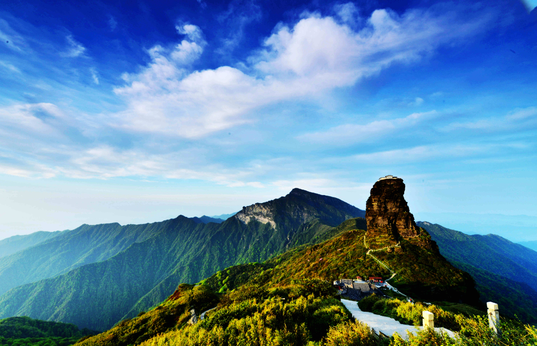 梵净山风景名胜区位于铜仁市,横跨江口、印江和松桃三县,拥有地球同纬度上保存最完好的原始森林,是云贵高原向湘西丘陵的过渡地带,群峰高耸,千沟万壑,有高山石林峰群,堪称鬼斧神工。红枫叶是梵净山秋天的标志。整个山头交织着万紫千红,成片的枫叶,与山上的庙宇相映衬,好似一幅美丽画卷。