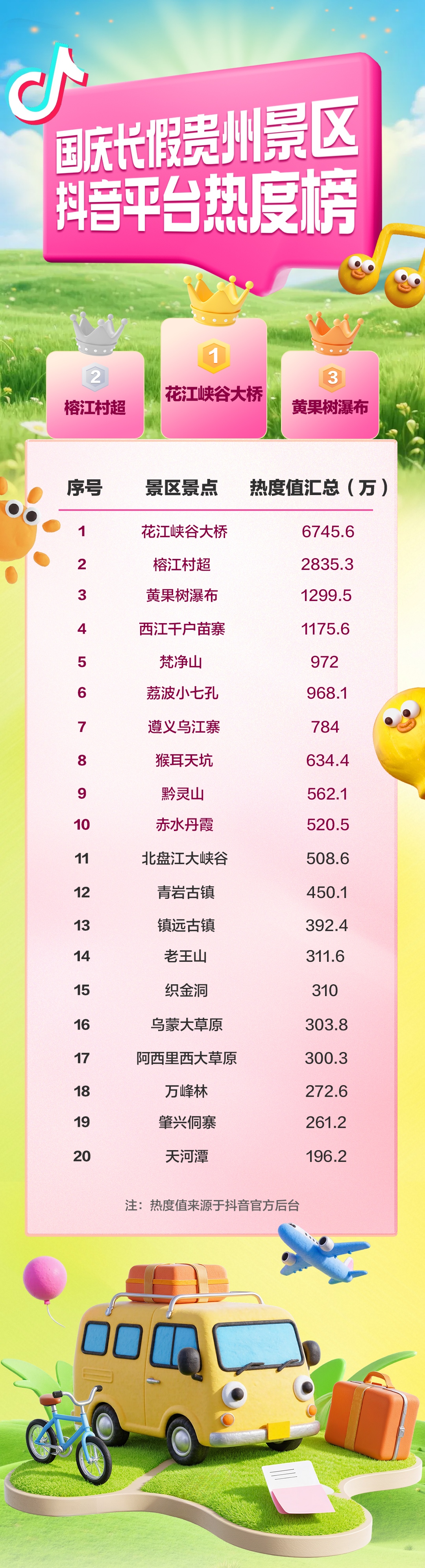 根据抖音后台数据,“贵州文旅”官方抖音号发布《国庆长假贵州景区抖音平台热度榜》。花江峡谷大桥、榕江村超、黄果树瀑布分获榜单前三名,西江千户苗寨、梵净山、荔波小七孔、遵义乌江寨、猴耳天坑、黔灵山、赤水丹霞位列前十。