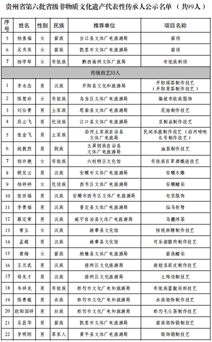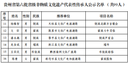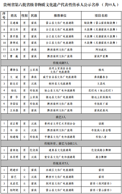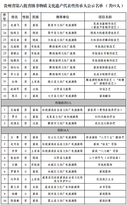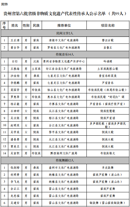贵州省文化和旅游厅根据《贵州省省级非物质文化遗产代表性传承人认定与管理办法(试行)》《贵州省非物质文化遗产保护条例》,组织开展了第六批省级非物质文化遗产代表性传承人(以下简称“省级非遗代表性传承人”)申报评审工作。